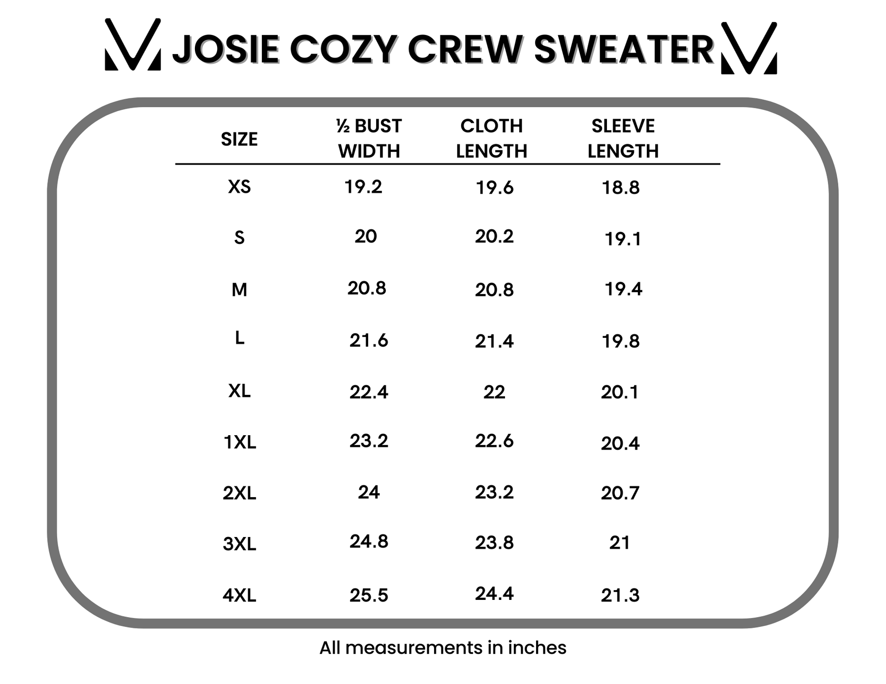 Wrap yourself in pure comfort with the Josie Cozy Crew Sweater. Crafted from the softest sweater fabric imaginable, this effortless layer is your new spring essential. The relaxed crew neckline and cozy fabric makes it the perfect companion for crisp mornings and lazy afternoons alike. Spring coziness for when you need it!