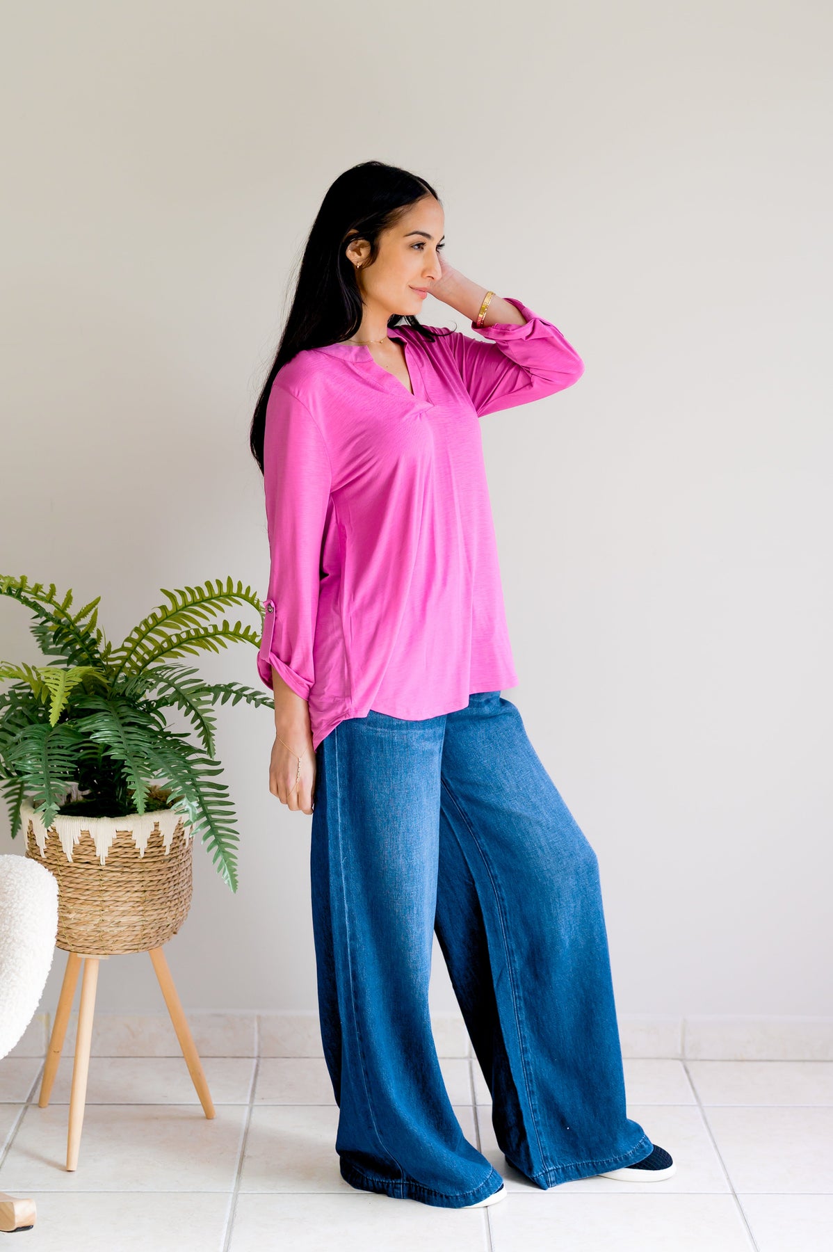 Wrinkle-free and ready to go—the Lucy in the Sky Top in Magenta does the heavy lifting so you don't have to. Three-quarter sleeves with tab details, a mandarin collar, and notched neckline bring the style, while the relaxed fit and high-low hem keep things effortlessly trendy. No ironing, no stress, just pure fashion fun.