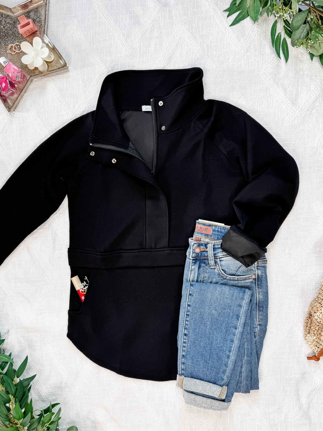 Unleash your playful side with the Mia Scuba Halfzip. Made from scuba fabric, this pullover features a faux center lappet, halfzip, pockets, and two snap buttons at the collar for extra warmth. With a curved hemline and cuff sleeves, it's perfect for adding a touch of quirk to any outfit. (And yes, it's as fun to wear as it sounds!)