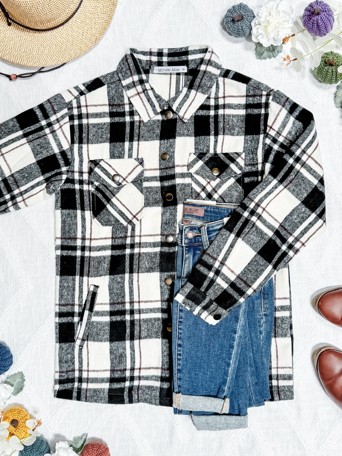 Meet Norah, our custom-cut shacket! This is a Michelle Mae exclusive, and you cannot get our fit anywhere else! This has a relaxed fit design, making it great for layering. It has features of a straighter bottom hem, snap buttons that are functioning and the two front upper pockets are fold over, functioning pockets with a snap button! Micro plaid design with white and black colors.